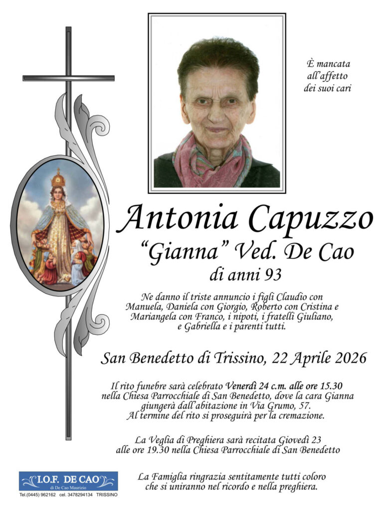 La ditta di Onoranze Funebri De Cao ha sede a Trissino in provincia di Vicenza ed è specializzata nell’offerta di servizi funerari, dal trasporto della salma fino alla sepoltura, passando per tutte le pratiche burocratiche legate al funerale, occupandosi di ogni incombenza dei propri clienti.